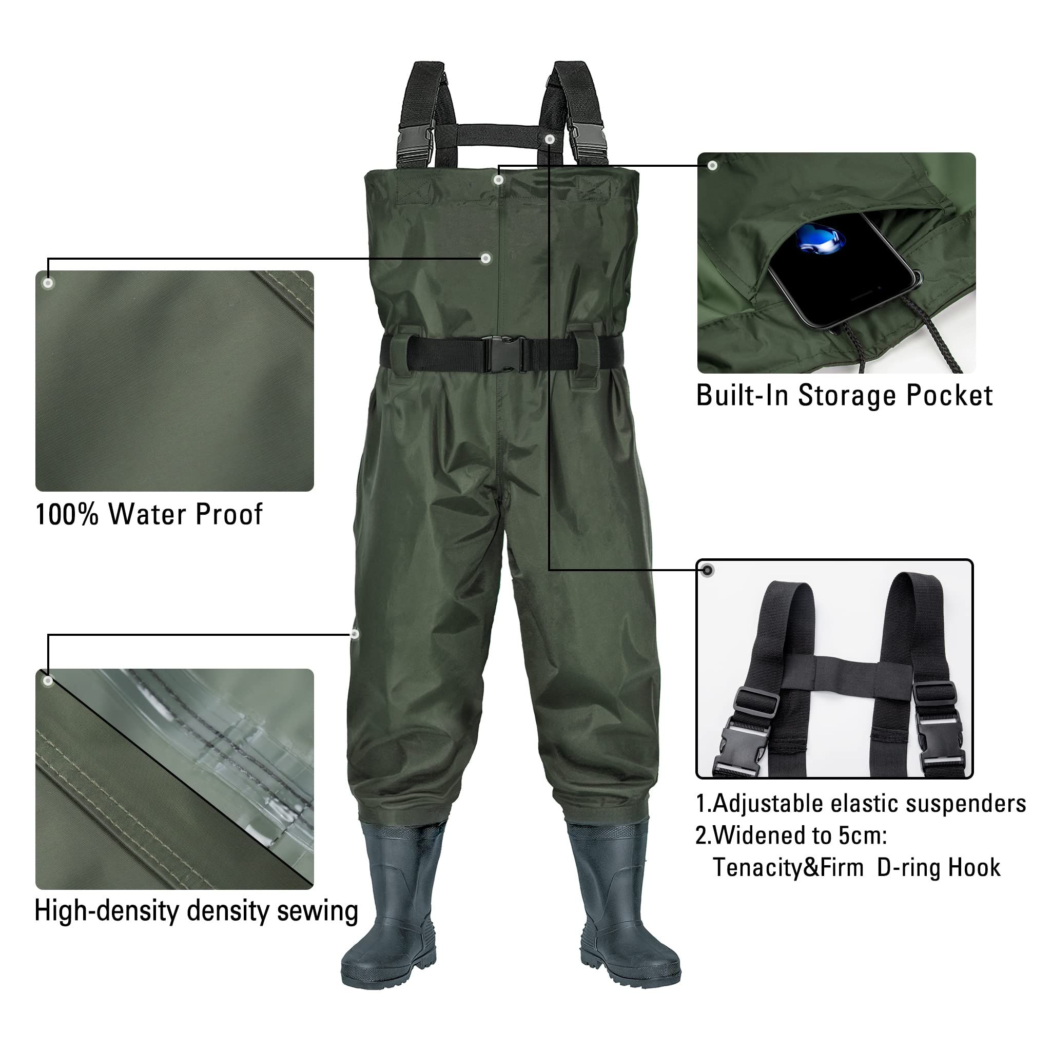 1.Color&Size: BELLE DURA Fishing waders have brown color and green, Both colors are perfect for men, women, youth, kids, boys and girls.PVC Boots with a standard size , waders with boots size 5 , Size 6, Size 7, Size 8, Size 9, Size 10, Size 11, Size 12, Size 13, Please choose your usual shoe size.If you have wide feet or need to wear thick socks, choose a size larger than usual.