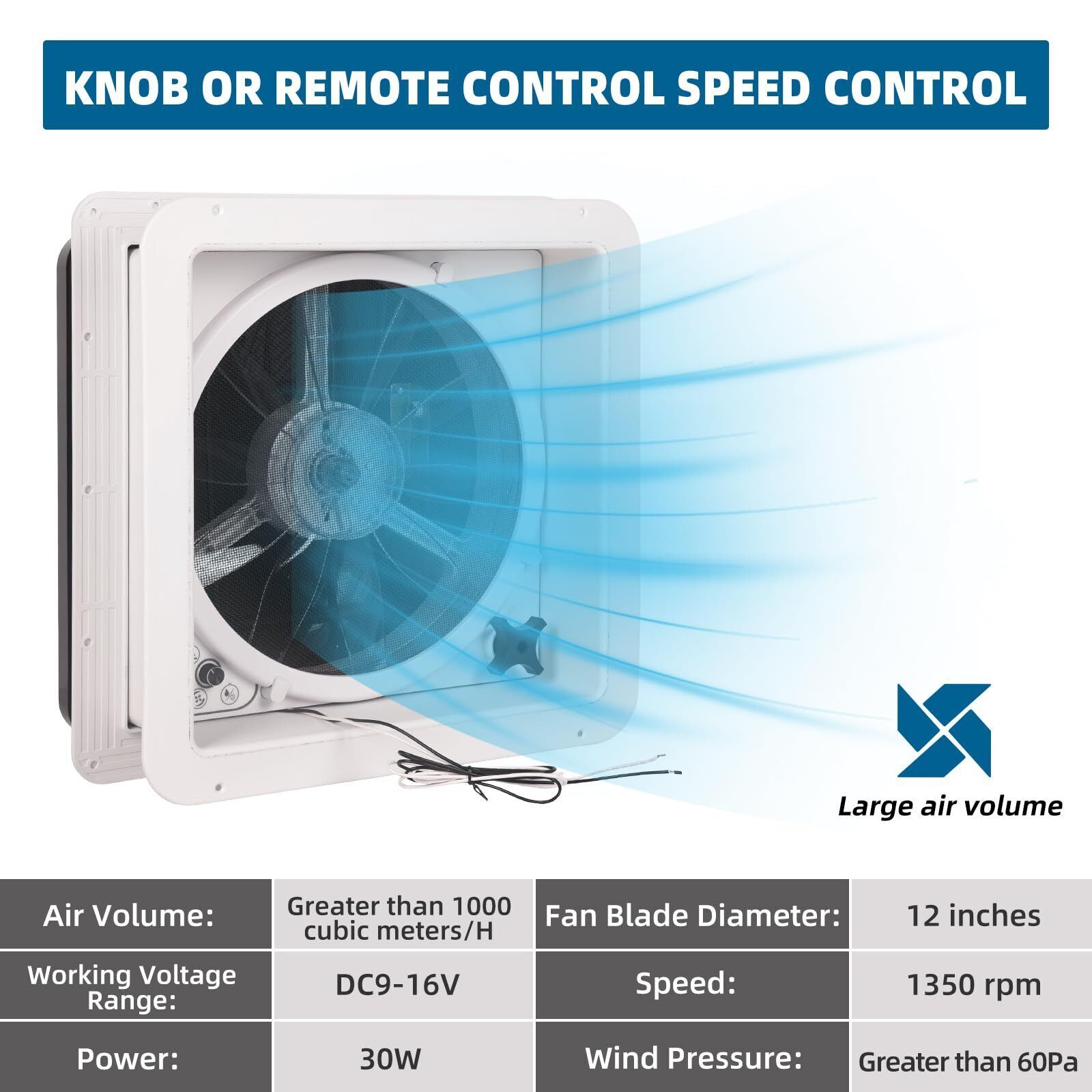 [������������������������ ���������������� ��������������������]The rv vent fan has continuously variable adjustable with 1000 CFM in both air-in and air-out mode,you can simply operate it by the button or the remote control.This RV exhaust fan allows you to keep your RV cool providing comfort when traveling in hot weather.